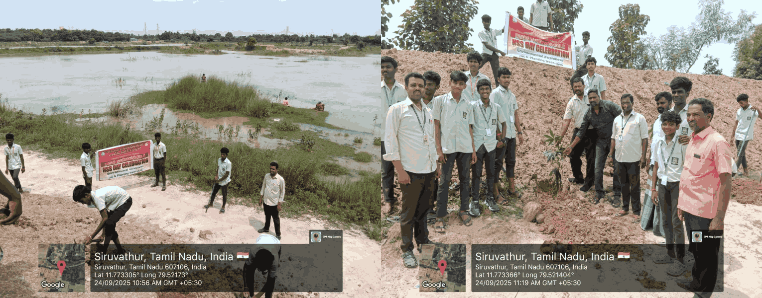 Planting palm seeds programme was conducted on 24th September 2025 in Anguchettypalayam Lake on the occasion of National Service Scheme Day. The chief guests were Mr. D. Mohan Das, President of Anguchettypalayam Panchayat Council and Mr. Shankar, clerk, Anguchettypalayam, who participated and planted saplings. NSS programme officers Mr. J. Balaji, Mr. M. Arulraj participated. Mr. Balasundaram YRC officer and Mr. Arivazhagan, Workshop Instructor were participated.